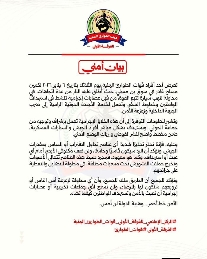قوات الطوارئ اليمنية تُحذر من "خلايا إجرامية" بعد تعرض أحد أفرادها لكمين مسلح بمارب