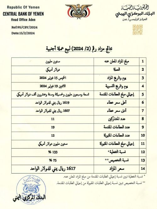 البنك المركزي يعلن بيع 60 مليون دولار بسعر 1617 ريالاً للدولار الواحد