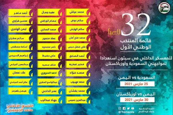 أعلن مدرب المنتخب الوطني الاول لكرة القدم سامي النعاش عن القائمة المختارة استعداداً لمباراتي السعودية واوزباكستان يومي 25 و30 مارس القادم , ضمن التصفيات المزدوجة المؤهلة الى كأس العالم (قطر2022) وكأس اسيا (الصين2023).