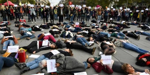شاركت مئات النساء، السبت، في احتجاجات بوسط باريس اتخذن فيها أوضاعا كالموتى، أملا في جذب الانتباه للعنف الأسري ضد المرأة.