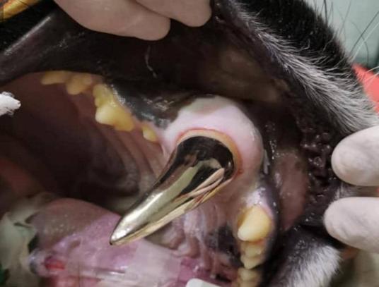 وقال الجراحون إن زراعة الناب الذهبي وتثبيته، كانت ضرورية لوقف معاناة الحيوان الضاري أثناء تناول الطعام.