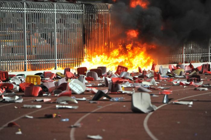 وشهدت أحداث المباراة تحطيم الكراسي في الملعب ورميها، وسط تراشق بالمقذوفات بين مشجعي الفريقين وقوات الأمن الجزائرية.