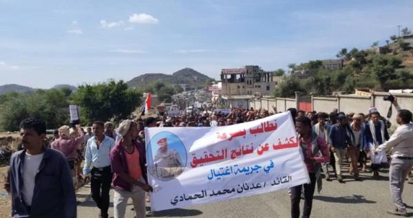 وأتت هذه المسيرة بعد يوم واحد على وصول اللجنة الرئاسية المكلفه بالتحقيق في جريمة اغتيال العميد عدنان الحمادي إلى مقر اللواء 35 مدرع في منطقة العين بمديرية المواسط.