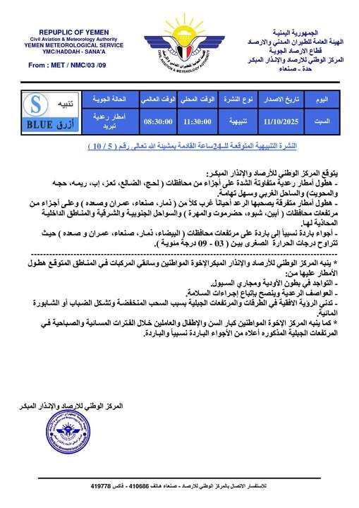 حذر المركز الوطني للأرصاد والإنذار المبكر اليوم السبت الموافق 11 أكتوبر 2025 من حالة جوية متقلبة وشديدة خلال الـ 24 ساعة القادمة.
