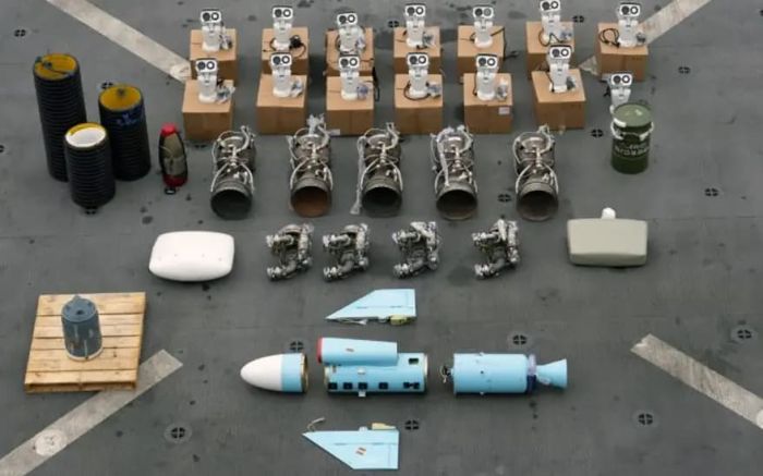 وجرى الاستيلاء على أسلحة تقليدية متقدمة إيرانية الصنع، شملت مكونات صواريخ باليستية، ومكونات صواريخ كروز مضادة للسفن، ورأس حربي، أثناء تفتيش القارب.