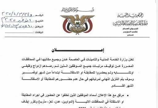 أعلنت وزارة الخدمة المدنية والتأمينات في العاصمة المؤقتة عدن عن نشر كشوفات تضم أسماء موظفين في القطاع المدني تبيّن وجود ازدواج أو تشابه وظيفي لهم مع العاملين في القطاعين العسكري والأمني.