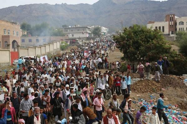 تظاهر المئات في مديرية المواسط جنوب محافظة تعز جنوب غرب اليمن، اليوم السبت، للمطالبة بكشف نتائج التحقيقات في قضية اغتيال قائد اللواء 35 مدرع العميد عدنان الحمادي.
