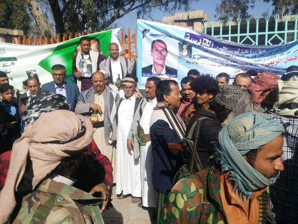نظم عدد من التربويين والشخصيات الاجتماعية من ابناء ريمة وقفة احتجاجية امام مبنى وزارة الدارخلية للمطالبة بتسليم قتلة الاستاذ فيصل الريمي وسط العاصمة صنعاء والفارين من وجه العدالة