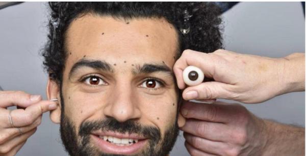 كما ظهر صلاح في الصورة بينما يضع المصممون في المتحف عين من الشمع بجوار وجه نجم ليفربول لمقارنة لونها بحيث يتم اختيار اللون المشابه لعين صلاح.