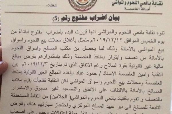 بائعو اللحوم والمواشي بصنعاء يعلنون إضرابا مفتوحا بسبب ابتزاز المليشيات