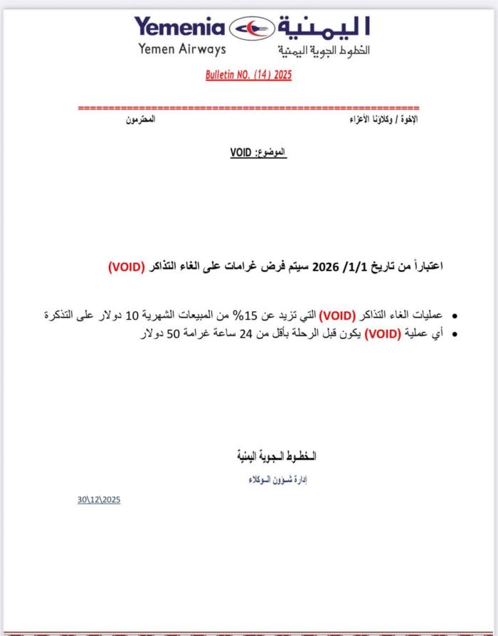 الخطوط الجوية اليمنية تقر ضوابط وغرامات جديدة على "إلغاء التذاكر" مطلع 2026