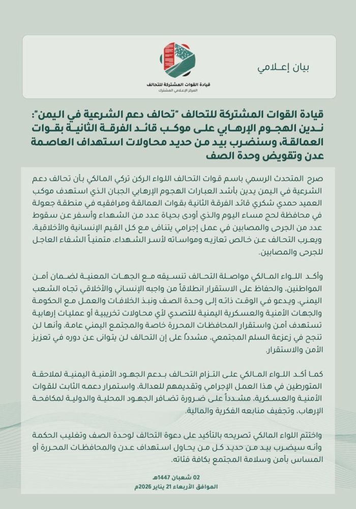 "التحالف" يدين استهداف موكب قائد بالعمالقة ويتوعد بضرب "بيد من حديد" كل من يحاول زعزعة أمن عدن