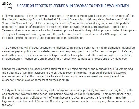 UN envoy’s office issued an update on efforts to secure a road map to end the war in Yemen