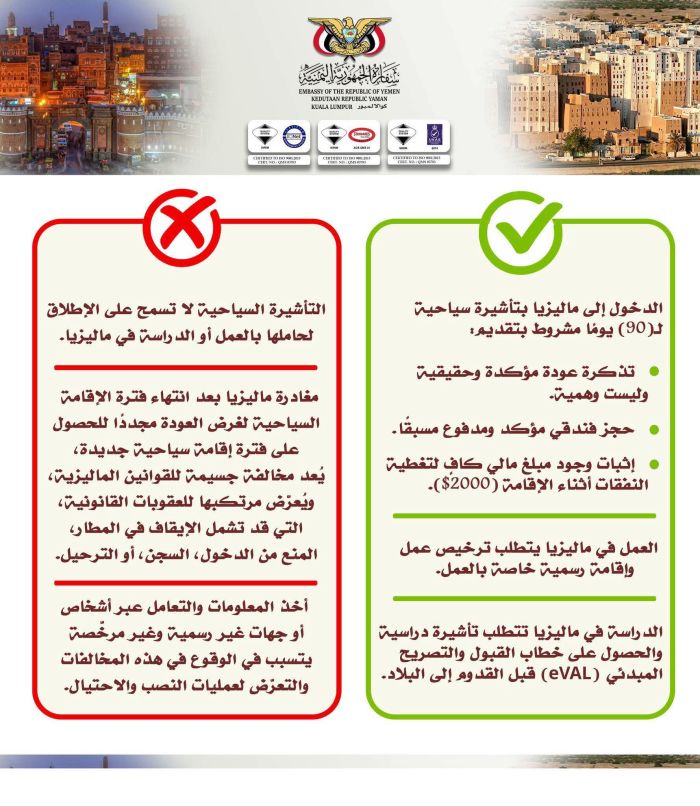 وشددت السفارة على أن التأشيرة السياحية لا تخوّل حاملها العمل أو الدراسة داخل ماليزيا، مبينة أن العمل في البلاد يتطلب الحصول على ترخيص رسمي وإقامة مخصصة لذلك، بينما تستوجب الدراسة استخراج تأشيرة دراسية مسبقة والحصول على خطاب القبول والتصريح المبدئي (eVAL) قبل السفر.