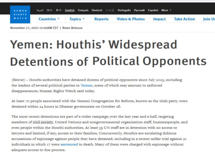 Houthi rebels authorities have detained dozens of political opponents since July 2025, including the leaders of several political parties in Yemen, some of which may amount to enforced disappearances, Human Rights Watch (WHO) reported recently.