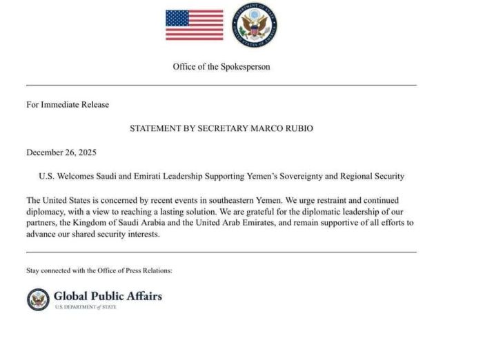 أصدر وزير الخارجية الأمريكي، ماركو روبيو، بياناً صحفياً أعرب فيه عن ترحيب الولايات المتحدة بالدور القيادي الذي تلعبه كل من المملكة العربية السعودية ودولة الإمارات العربية المتحدة في دعم سيادة اليمن وتعزيز الأمن الإقليمي.