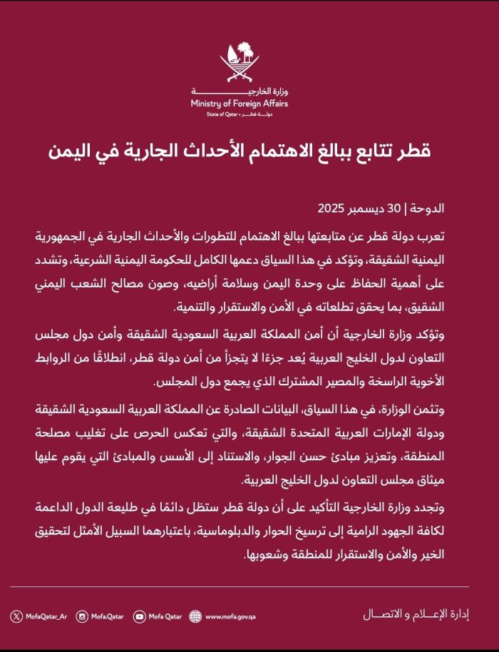وأكدت دولة قطر في بيان صادر عن وزارة الخارجية اليوم، دعمها الكامل لـ الحكومة اليمنية الشرعية، مشددة على ضرورة الحفاظ على وحدة اليمن وسلامة أراضيه. وأشار البيان إلى أن صون مصالح الشعب اليمني الشقيق هو الأولوية القصوى بما يحقق تطلعاته في الأمن والاستقرار والتنمية.