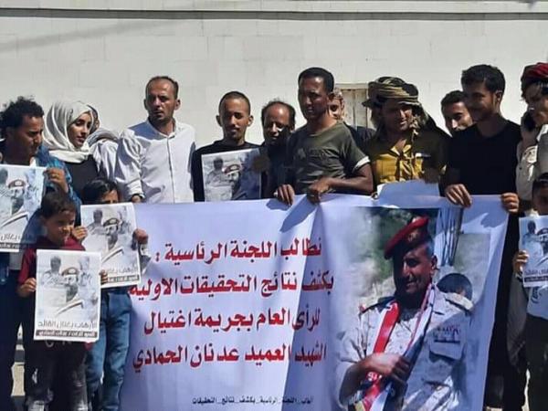 نُظمت، الأحد، وقفة احتجاجية أمام مكتب النائب العام بعدن، للمطالبة بكشف الحقائق في جريمة اغتيال الشهيد القائد العميد عدنان الحمادي.