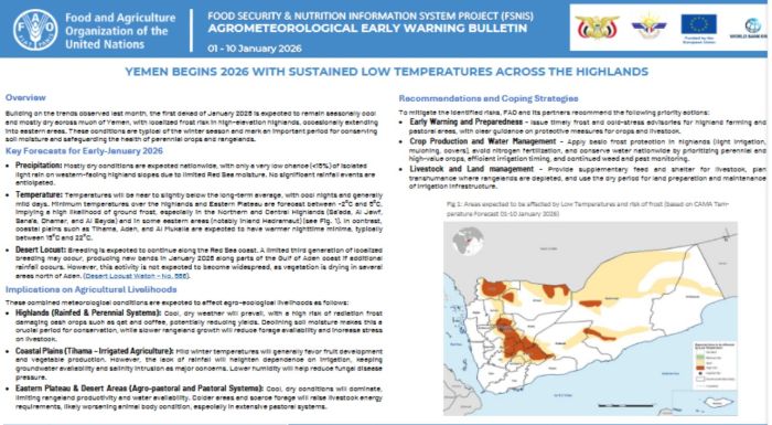 Yemen begins 2026 with sustained low temperatures across the highlands and January is expected to remain cool and mostly dry across the country, according to agro meteorological early warning bulletin, issued by Food and Agricultural Organization (FAO).