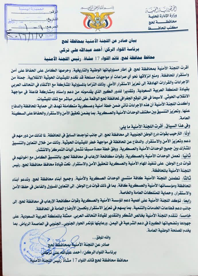رحبت اللجنة الأمنية بمحافظة لحج، برئاسة اللواء الركن أحمد عبدالله علي تركي، محافظ المحافظة وقائد اللواء 17 مشاة، بدخول طلائع قوات "درع الوطن" إلى المحافظة لتكون رافداً للقوات المتواجدة سابقاً، مشيرة إلى أن هذا الانتشار يأتي وفق خطة أمنية وعسكرية معدة مسبقاً لتنظيم آليات التمركز والانتشار.