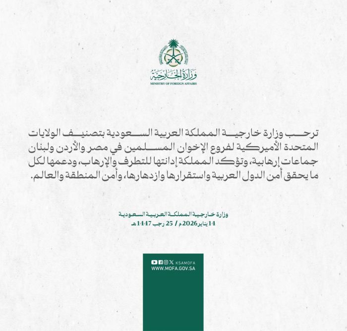 أعربت وزارة الخارجية في المملكة العربية السعودية عن ترحيبها بالقرار الصادر عن الولايات المتحدة الأمريكية القاضي بتصنيف فروع جماعة "الإخوان المسلمين" في كل من مصر والأردن ولبنان كجماعات إرهابية.
